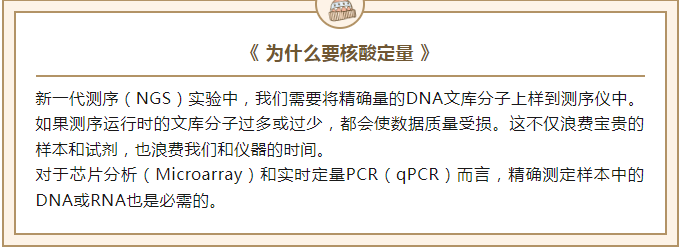 新一代測序(NGS)實驗中,我們需要將精確量的DNA文庫分子上樣到測序儀中。如果測序運行時的文庫分子過多或過少,都會使數(shù)據(jù)質(zhì)量受損。這不僅浪費寶貴的樣本和試劑,也浪費我們和儀器的時間。對于芯片分析(Microarray)和實時定量PCR(qPCR)而言,精確測定樣本中的DNA或RNA也是必需的。